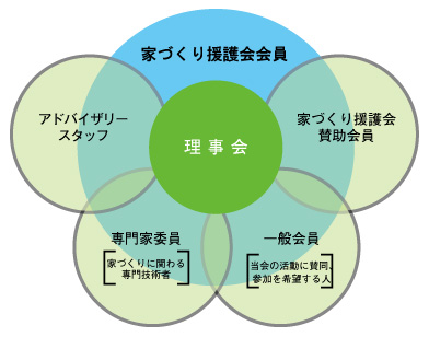1.会員:専門家委員と一般会員からなり、各種のボランティア活動をはじめ家づくり援護会のめざす活動を実施する人たちです。会の活動は会則に基づいて行われます。